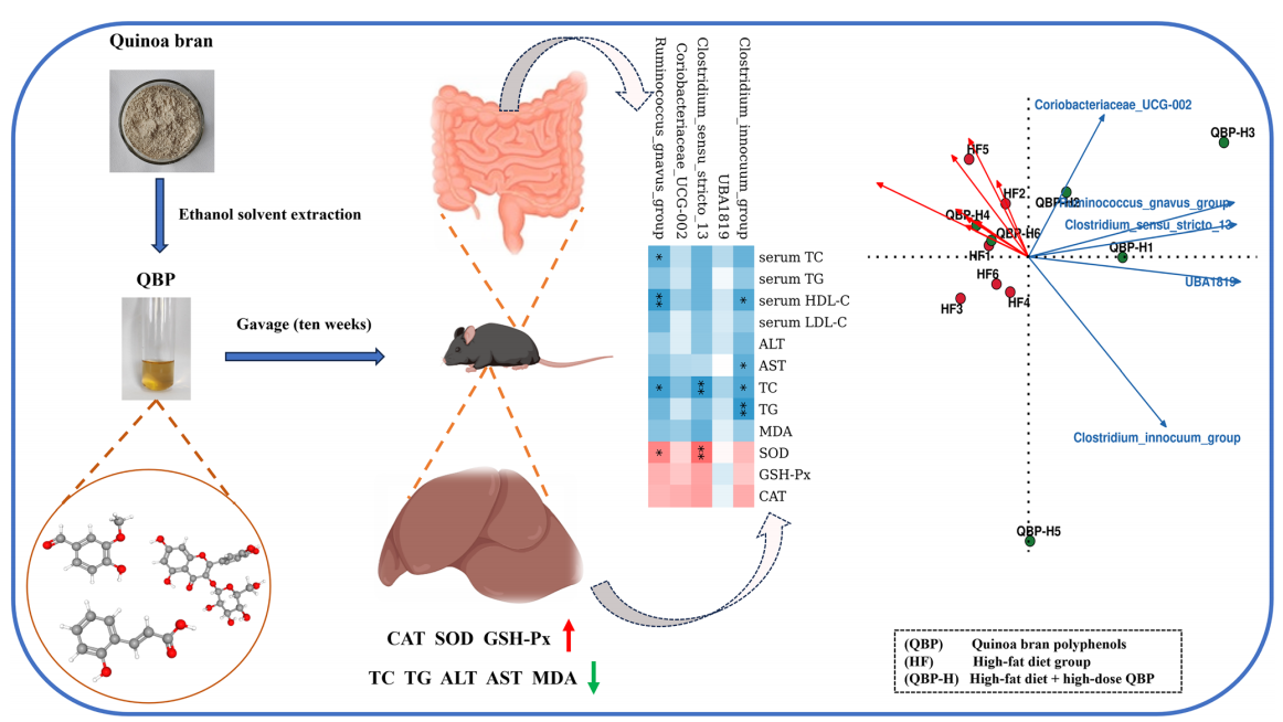 藜麦麸皮是藜麦加工的副产品,富含多酚类生物活性物质。该研究采用高脂饮食建立了 C57BL/6小鼠非酒精性脂肪肝模型,以探讨藜麦麸皮多酚提取物(QBP)对小鼠非酒精性脂肪肝的干预效果。结果显示QBP能有效减轻非酒精性脂肪肝小鼠的脂质代谢异常和肝脏脂肪堆积,并能减轻炎症反应。16S rRNA测序分析表明,QBP能调节肠道微生物群的组成,增加了有益菌Clostridium_innocuum_group、Clostridium_sensu_stricto_13、Ruminococcus_gnavus_group、Coriobacteriaceae_UCG_002和 UBA1819的丰度。代谢组学发现了51种因补充QB的差异代谢物。功能预测表明,淀粉和蔗糖代谢以及戊糖和葡萄糖酸盐相互转化是QBP减轻非酒精性脂肪肝的关键代谢途径,而这可能受到肠道微生物群的影响。这些结果表明QBP在缓解非酒精性脂肪肝和保护肝脏方面具有很大的应用潜力。