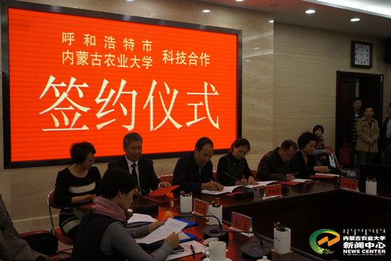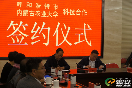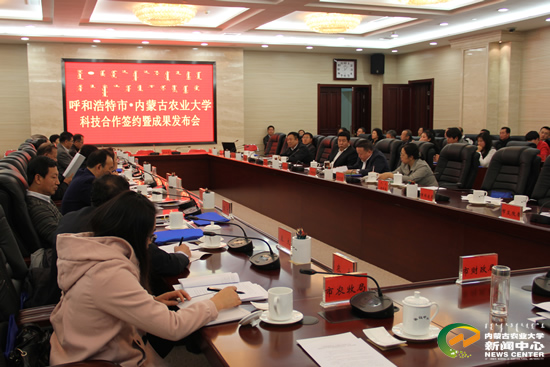 11月5日上午,“呼和浩特市•内蒙古农业大学科技合作签约暨成果发布会”在呼和浩特市党政大楼会议中心301会议室举行,会议由呼和浩特市政府副秘书长斯日古楞主持。呼和浩特市政府副市长王恒俊、我校校长李畅游出席并分别致辞,王恒俊与我校副校长芒来共同签署了“呼和浩特市•内蒙古农业大学全面科技合作协议”。自治区教育厅副巡视员倪培霖、科技厅副厅长杨劼参加签约会并讲话。呼和浩特市人大副主任付东海、政协副主席陈曼莉参加会议,呼和浩特市组织部、经信部、人社局、科技局、农牧局、经济技术开发区、旗县区科技局及有关企业代表领导参加会议。我校科技处、有关学院和专家30多人参加会议。