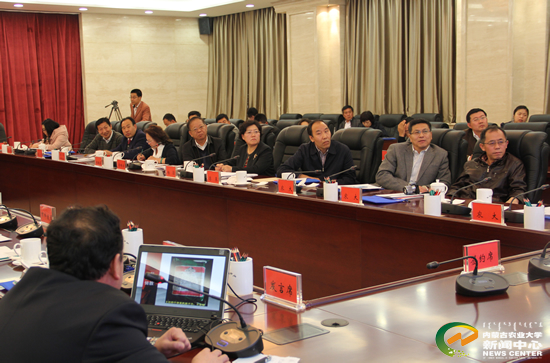 我校校长李畅游(中)、自治区教育厅副巡视员倪培霖(左四)、 自治区科技厅副厅长杨劼(右四)出席签约会并分别讲话。图为与会领导听取科研成果发布。 |