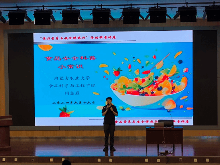 闫鑫磊为现场师生开展了《日常生活中的食品营养与安全》科普讲座。讲座中,闫鑫磊凭借其深厚的专业知识和丰富的实践经验,详细剖析了各种食品安全问题的成因和危害。他通过大量案例和数据,让师生们深刻认识到食品安全隐患就在身边。闫老师还就相关内容回答了现场听众的提问,受到了大家的热烈欢迎。