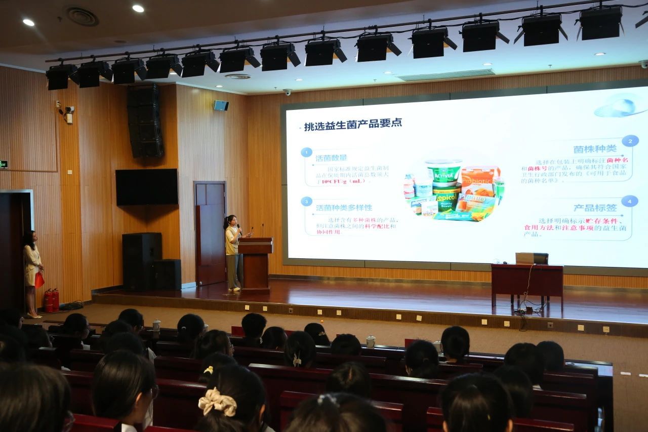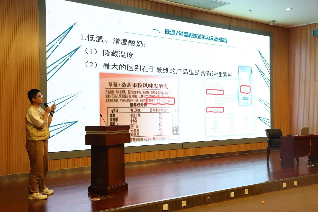 我院研究生、内蒙古营养学会会员王露瑶、郭成成分别带来了《益生菌该怎么选》《奶制品科普——酸奶的挑选》的讲座,为听众详细讲解了益生菌的选择与使用方法以及如何在市场上选购优质的酸奶。