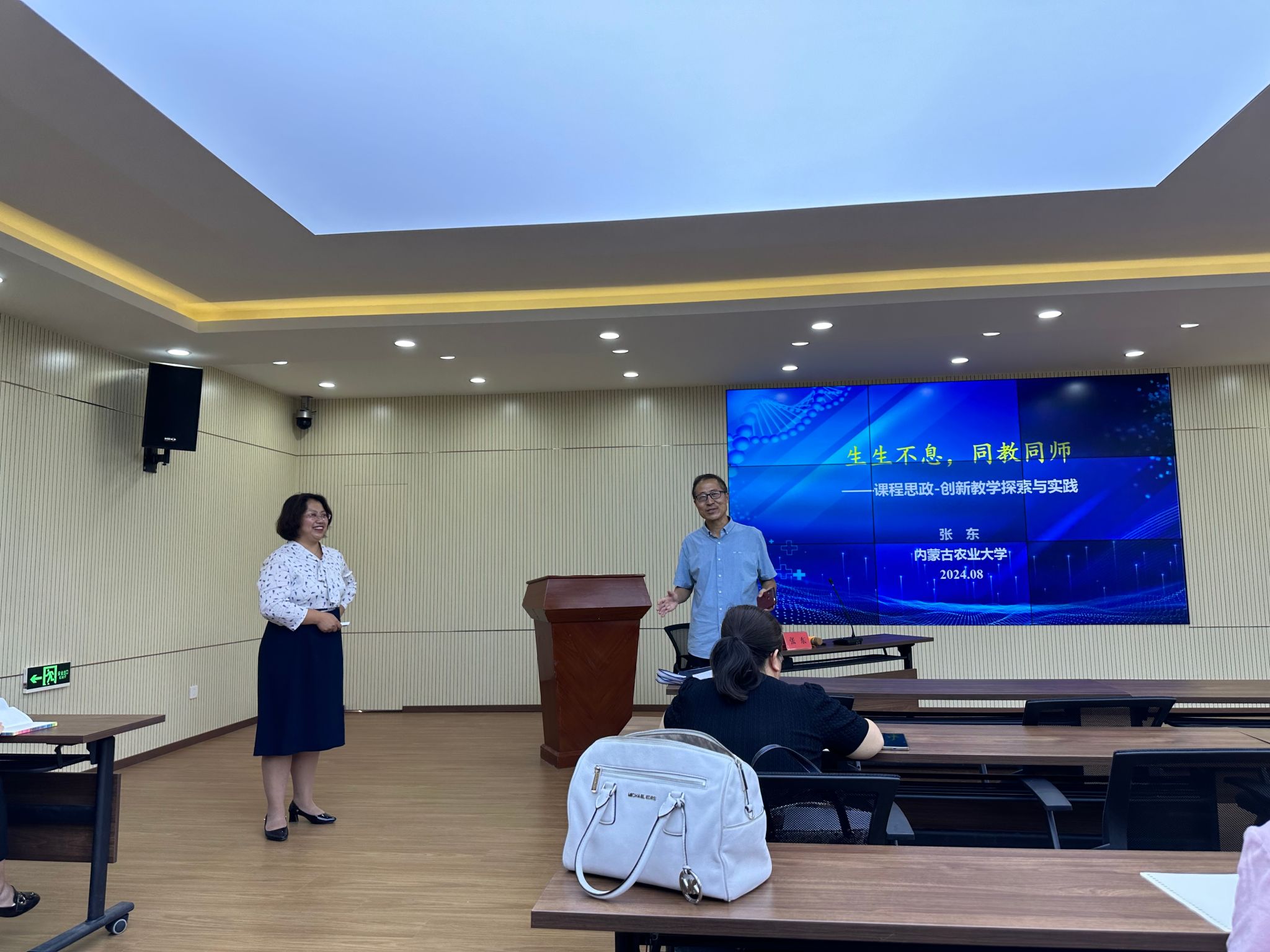 为深入贯彻党的教育方针,全面落实立德树人根本任务,进一步提升我院教师的课程思政教学能力和教学创新水平,2024年8月28日,我院邀请2023年获得第三届全国高校教师教学创新大赛新工科正高组二等奖、2023年获内蒙古自治区第三届教师教学创新大赛正高组特等奖、2021年获内蒙古自治区首届普通高校课程思政教学技能大赛一等奖的草业学院的张东老师,来我院进行课程思政和创新教学的培训活动。此次培训旨在通过课程设计、案例分析、创新教学方式等多种形式,帮助教师深刻理解课程思政的内涵与要求,掌握创新教学方法,促进专业知识与思政元素的有机融合。培训由王俊国院长主持,全体教师参加。