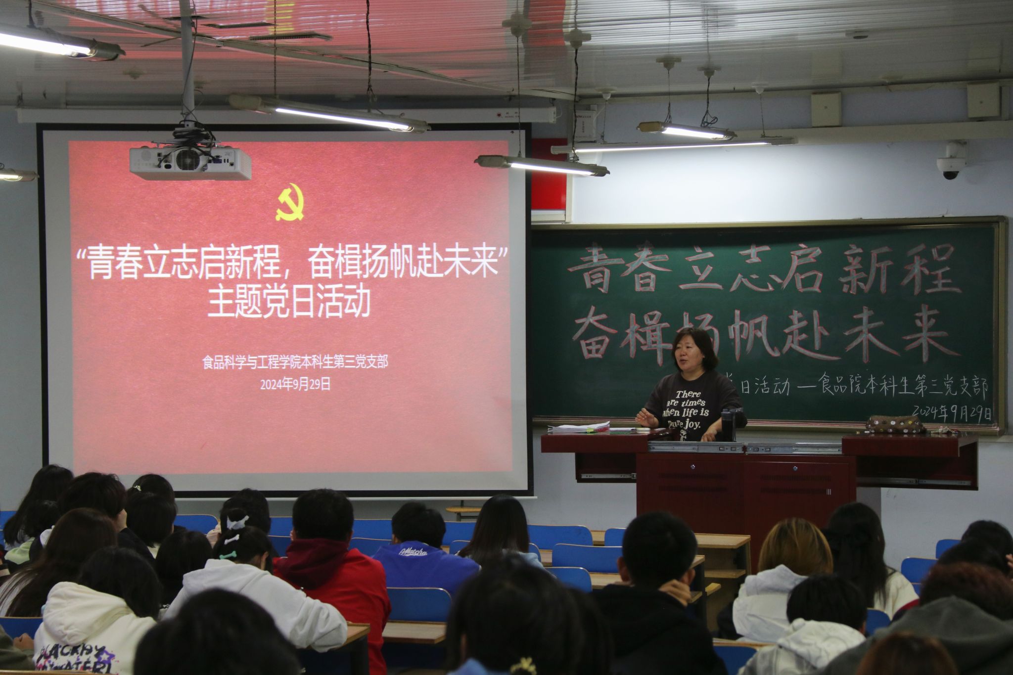为提高专业认知水平、加强学习规划意识,9月29日晚上7:00,我院本科生第三党支部组织开展了“青春立志启新程,奋楫扬帆赴未来”主题党日活动。活动由本科生第三党支部书记王彩霞主持,本科生第三支部成员杨静娜、杨贻迪、崔凤祺、刘逸菲四位获得2025届推荐免试攻读研究生资格的同学作为嘉宾参加了分享会。我院2024级食品质量与安全专业学生及第三支部成员到场参加。