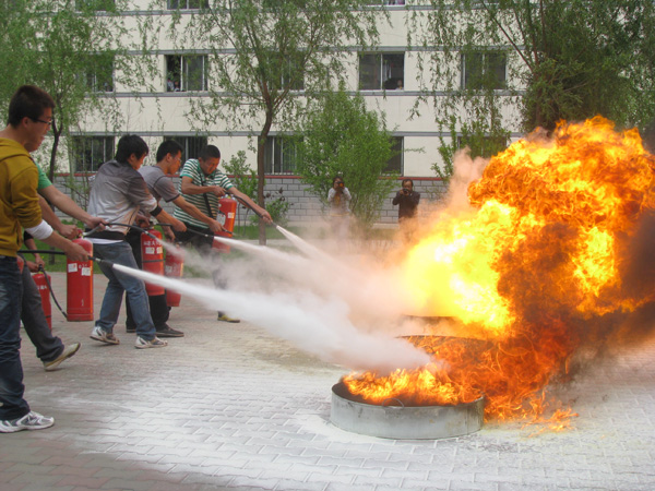 消防演习在主持人的解说下正式开始,首先进行的是发生火灾时的安全逃生演习,随着警报声的响起,同学们有序的从发生火灾的宿舍楼内逃往安全地带。随即,消防车赶到了火灾现场,立即对宿舍楼内的被困同学进行了营救,并开始对着火建筑进行扑灭工作;十分钟后,大火被顺利扑灭。安全逃生演习圆满成功。贺鹏龙同志对本次安全逃生演习进行了点评,并向在场的同学们传授了关于火灾发生时的应对措施。