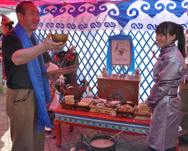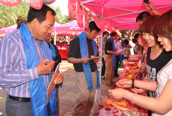 优美的布里亚特民族舞中拉开了本届饮食文化节的帷幕,内蒙古农业大学团委书记那森巴雅尔为大第八届饮食文化节致了开幕词,他希望通过这次活动的举办可以增强同学们的食品安全意识,关注食品安全,并预祝本届饮食文化节可以圆满成功。接着歌曲联唱、茶艺等节目轮番上演,将活动推向了高潮。随后,在大家的欢呼声中,评委老师们纷纷深入到“美食街”,品尝同学们精心设计的美食,纷纷做了精辟的点评,并为每个班级打了分数。各式各样的美食瞬间成为了会场上的焦点,有美味的蛋糕,别样的花式水果,极具有民族风味的餐点,如牛肉干、奶酪等引来了在场同学们的围观。围绕着“美食街”的还有种类繁多的展台,例如法国红酒展台,日本料理展台等,无形的透露出饮食文化的艺术情节。