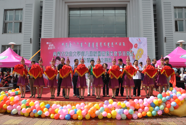 由内蒙古农业大学团委主办,伟德体育官网承办的内蒙古农业大学第八届“校园饮食文化节”开幕式于5月22日下午3:00在西区大食堂门口隆重举行。此次活动以“峥嵘九十、珍食莫蚀”为主题,崇尚“民以食为天、食以安为先”的理念,旨在增强同学们对饮食健康的意识,传播和发扬中华传统饮食文化,从而为同学们今后的学习生活打下坚实的基础。出席此活动的领导嘉宾有内蒙古农业大学党委书记高晓英、副校长任强、副校长李金泉、蒙牛乳液常温液奶呼市经理陈晓阳、内蒙古农业大学团委书记那森巴雅尔、学生处处长张文、团委副书记石忠琴、李伟威、学生工作处副处长乌力吉、后勤管理处饮食服务中心经理张斌晓、伟德体育官网党委书记张星杰、伟德体育官网院长靳烨、副院长范贵生、食品业工程学院党委副书记兼副院长屈丰富、伟德体育官网内蒙古农业大学党委正处级组织员郝润明以及各班班主任、各院学生会主席。
