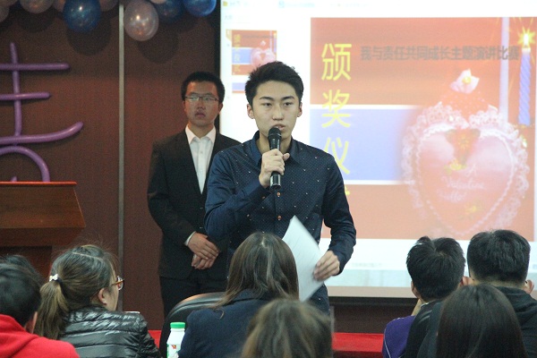 11月16日晚上7:00,我院顺利举办了“我与责任共同成长”主题演讲比赛。本次演讲比赛由分团委学生会心育部全力承办。学生工作办公室老师斯琴毕力格、学生会副主席陈美瑄、校园广播站副站长马骏驰、2012级广播站优秀广播员齐立峰、周蕊、任敏、王欣出席了此次比赛并担任评委。来自2013、2014级各个班级的三十三位选手参加了此次演讲比赛,各班级负责人及部分同学到场观看了此次比赛。