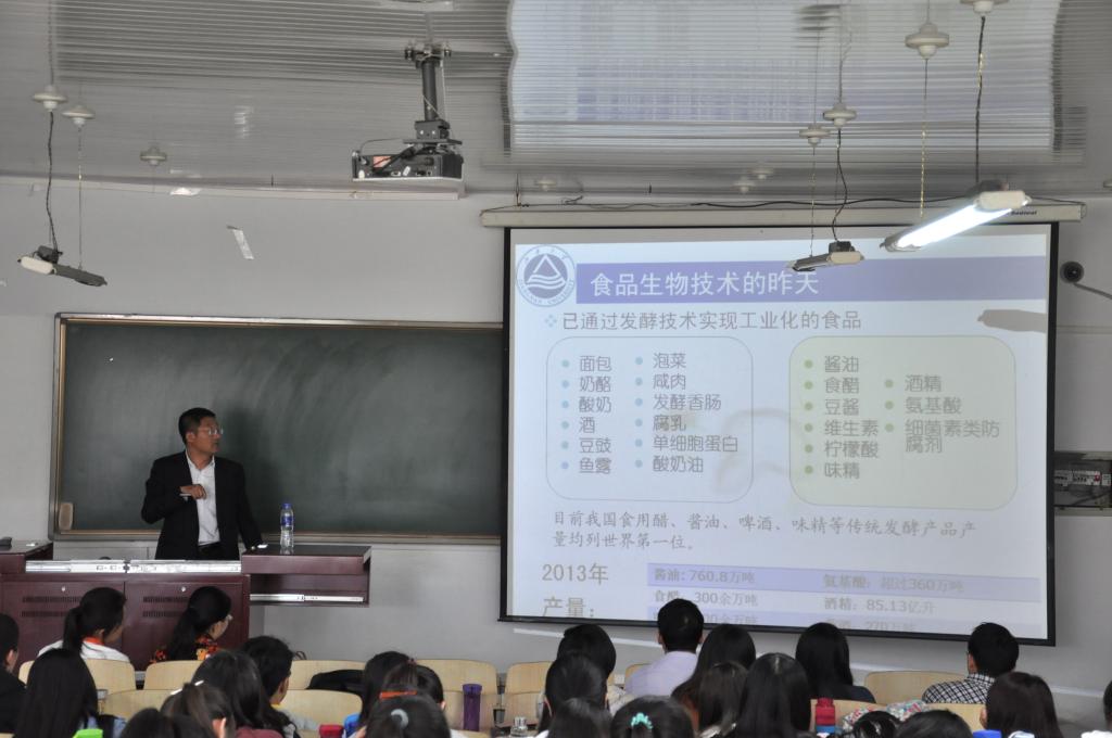 4月29日上午10点,我院于博学楼309教室举办了第六场本科生专题学术讲座,江南大学的陈卫教授作为主讲嘉宾为我院12级食品科学与工程专业和食品质量与安全专业的本科生和相关青年教师作了题为“现代食品生物技术创新发展与应用”专题讲座。讲座由教学副院长双全教授主持。陈卫教授利用2小时的时间,以精炼的语言介绍了生物技术的发展历程及特点、食品生物技术及其内涵、引用大量的案例将食品生物技术的传统酿造技术、现代食品酶利用技术,未来生物技术发展方向及其无限可能性进行了讲解。同学们认真听讲、认真做笔记,现场多次响起热烈的掌声,同学们受益匪浅,对食品生物技术有了更深的理解和启发。