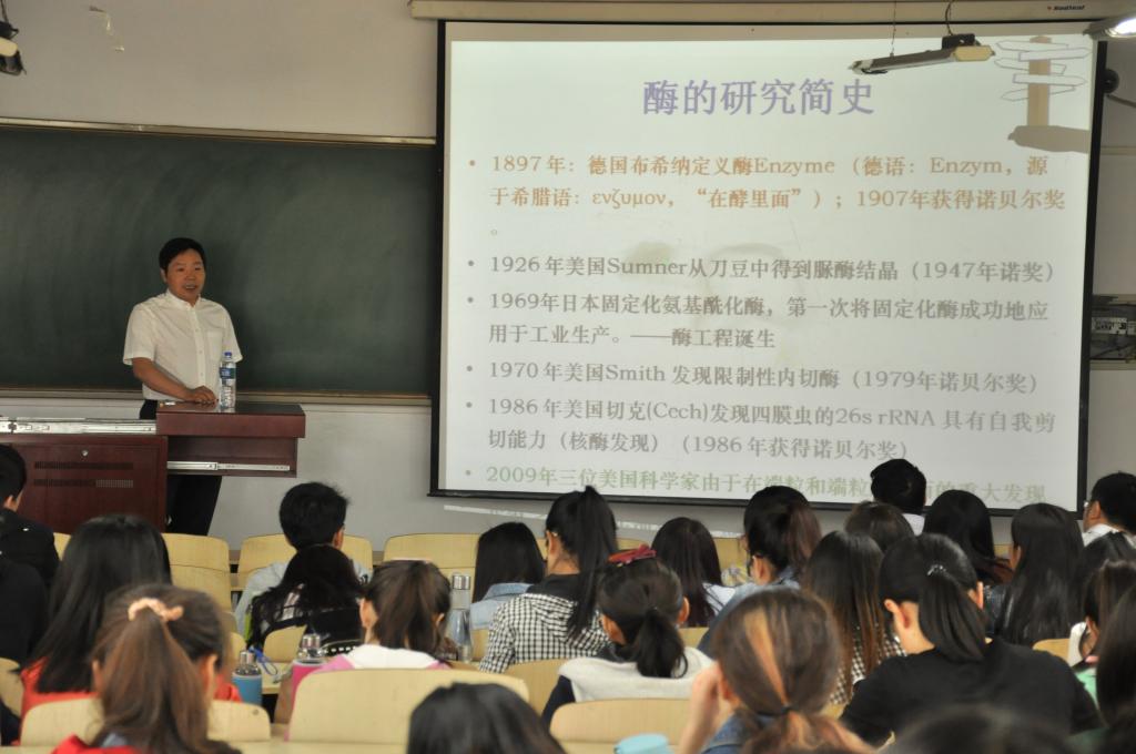 江正强教授利用2小时的时间,简练、清晰地介绍了酶的发展历史、人类对酶的认识过程、酶的定义、结构、提纯技术和国内外食品酶的生产情况、存在的问题以及发展方向,并结合大量的实例讲述了酶在食品工业中应用情况。江正强教授的介绍,同学们受益匪浅,对食品酶及其作用有了更深的理解。