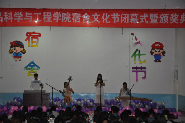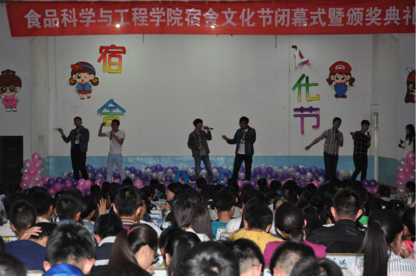 伴随着动感十足的音乐,舞蹈《NO.9》在姑娘们活力四射的表演下,点燃了晚会现场的气氛。晚会的第一首歌曲《一个像夏天一个像秋天》以双人舞的形式传达了舍友间纯洁而深刻的友谊。同样表达友谊的歌曲《遇见你的时候所有星星落在我头上》将相遇的美好、相处的快乐,通过歌曲联唱的形式生动形象地展示出来,让同学们深刻的感受到了相遇的难得和相知的可贵。不悔梦归处,只恨太匆匆,由学生会话剧团选送的话剧《匆匆那年》,诙谐幽默的语言引得全场掌声不断,爆笑连连。期间,还有蒙语歌曲《心的归宿》,醇厚质朴的音色让人仿佛置身于苍茫辽阔的草原之中。更有风靡全国的神曲舞蹈《小苹果》,一次又一次地将晚会推向了高潮。晚会最后所有参与表演的宿舍以及PPT展示获奖的优秀宿舍共同上台,唱响歌曲《相亲相爱》,嘹亮的歌声、温暖的歌词响彻了整个大厅。本届宿舍文化节闭幕式暨颁奖仪式也在大家的一片欢声笑语中落下帷幕。