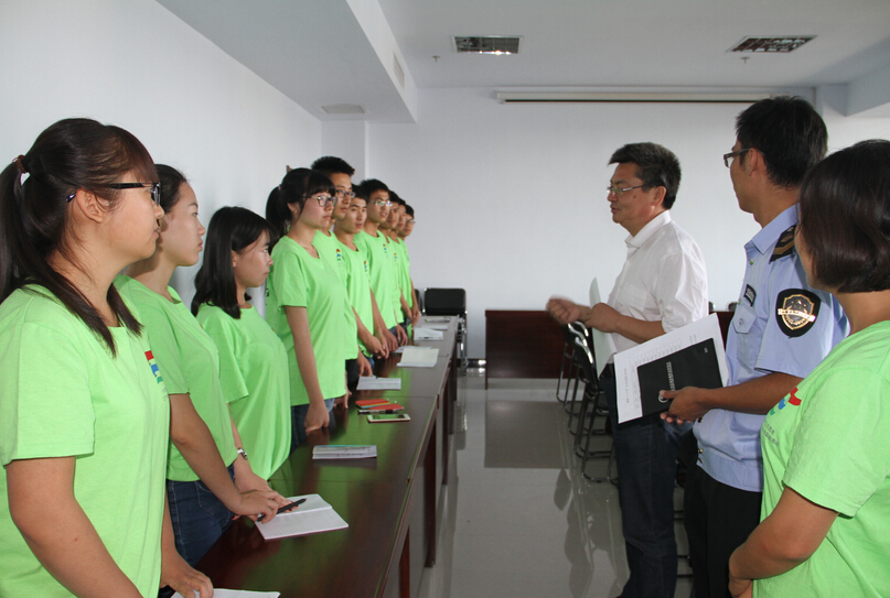 上午9:00,侯书记到达食药局,亲切地和同学们一一握手并询问大家的名字和年级,嘱咐同学们要珍惜此次实践机会,学习知识、锻炼能力,在保证个人安全的情况下,多听、多看、多学。食药局局长杜继东以及副局长孟飞热情地接待了侯书记,并向侯书记介绍了食药局的职能和办公情况以及实习安排。侯书记听完介绍后,代表学校向乌拉特前旗食品药品监督管理局就此次暑期实习活动提供的支持和帮助表示感谢,并希望双方有进一步深入的合作。带队老师王彩霞也简单介绍了同学们的吃住情况、以及实习具体安排和任务。在听到同学将会利用空余时间进行与自身专业相关的问卷调查时,侯书记露出满意的笑容,对同学们的实习计划和安排表示肯定。
