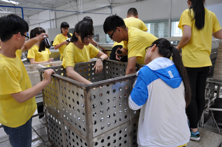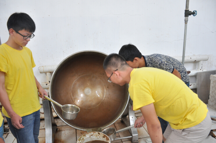 7月21日,早6:00队员们按时起床,吃完早饭以后,由任文明老师带领队员参观车间。介绍完车间的基本设施后,队员们陆续进入车间。在进车间之前,根据严格的程序,队员们穿上水鞋、工作服进入消毒室消毒后,方可进入。任老师简单的介绍了粉碎、一次灭菌、过滤、静置、二次过滤、灌装、二次灭菌、成品包装出厂等一些工序,这让队员基本了解到整个工艺的基本流程。