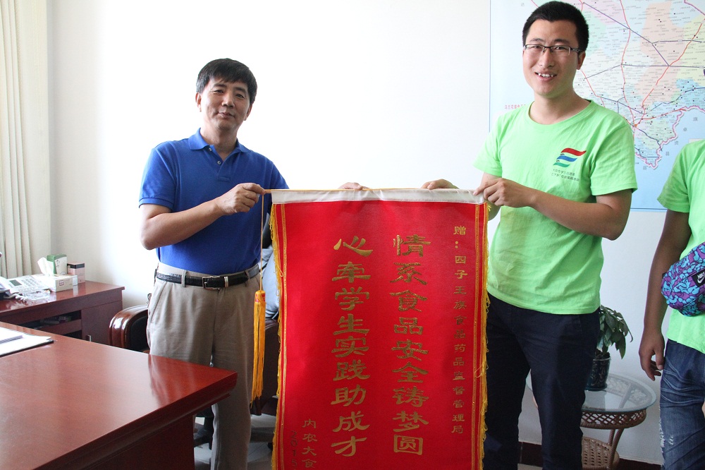 经过了四天的实践,队员们已经对手边的工作游刃有余,依旧怀着饱满的热情投入到工作中去。首先,队员们来到了各个科室的办公室,为工作人员们打扫了卫生。随后,为了表达对四子王旗食品药品监督管理局提供此次实践平台的感激之情,我队谨代表伟德体育官网赠予由我院党委书记张星杰题词的锦旗。同时,局领导对我队此次实习实践活动给予了非常大的肯定,并且叮嘱我们一定要好好学习专业知识,努力做好理论与实践相结合,在今后的生活中能够学有所用。最后,我们与食药监局的工作人员们进行了短暂的告别并合影留念。四子王旗食药局实习小分队的暑期社会实践活动就此画上圆满的句号。