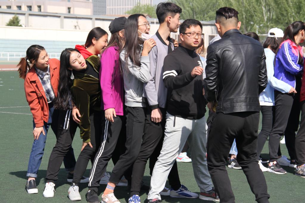 整个运动赛分为六个小组,每组八人进行趣味比赛,以名次积分。第一个游戏是胯下运球,接力完成;第二个游戏为你做我猜,第一个人看到提示,通过动作演示给下一个人,最后一个人猜;第三个游戏是夹球接力跑;第四个游戏是指压板跳绳;第五个比赛人体解锁;整个互动过程中,欢声笑语响遍操场,不时有锻炼的同学加入到比赛中来。
