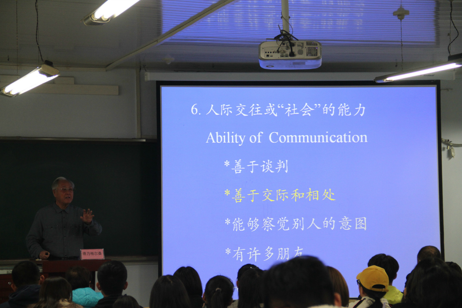德力格尔桑教授从中国传统饮食文化入手,通过比较中国四大饮食文化与西方饮食文化,展现出了中国饮食文化历史悠久、博大精深以及食品科学与工程专业的重要性。紧接着德教授介绍了我国社会经济下各行各业的蓬勃发展,用大量的数据和实例告诉同学们当今社会主义市场经济发展对人才的需求和挑战。他讲到,同学们正处于人生关键时期,作为潜在的“人才”需要面对非常多的困难与挑战。随后德教授旁征博引、引经据典,以贴近同学日常生活的实例告诉同学们天才少有,而“人才”可以自我培养”。他告诫同学们应利用好课堂学习、向社会学习、向其他人学习这三个渠道,在大学生活里培养积极的学习态度,设立自我鼓励的个人目标和学习方法,激发起对学习知识的激情,不断改进学习方法,取得长足的发展和进步。最后德力格尔桑教授激励同学们们珍惜现在、挑战未来,愿大家不辜负时代、不辜负人生、做好自己,勇敢面对未来。