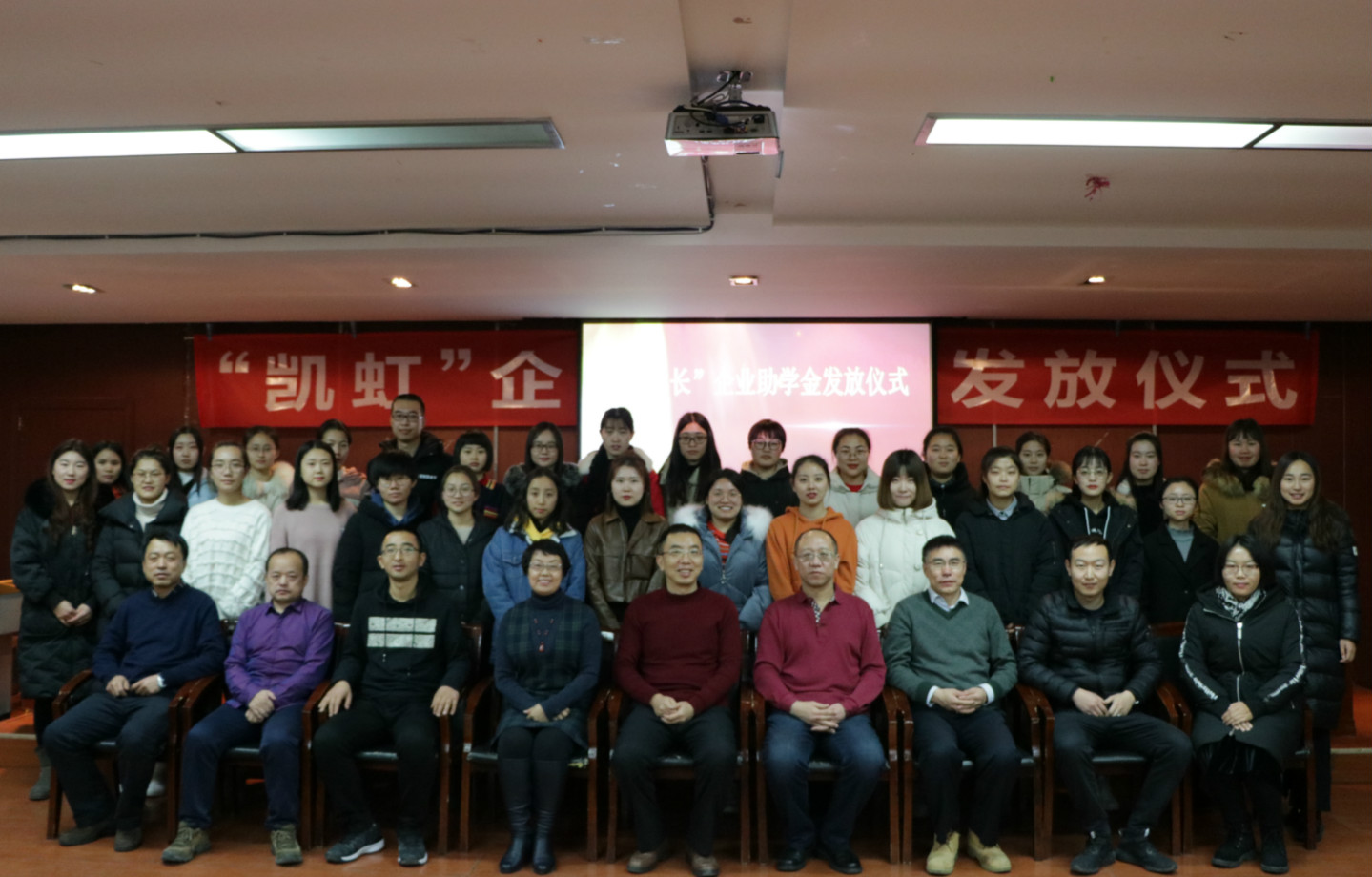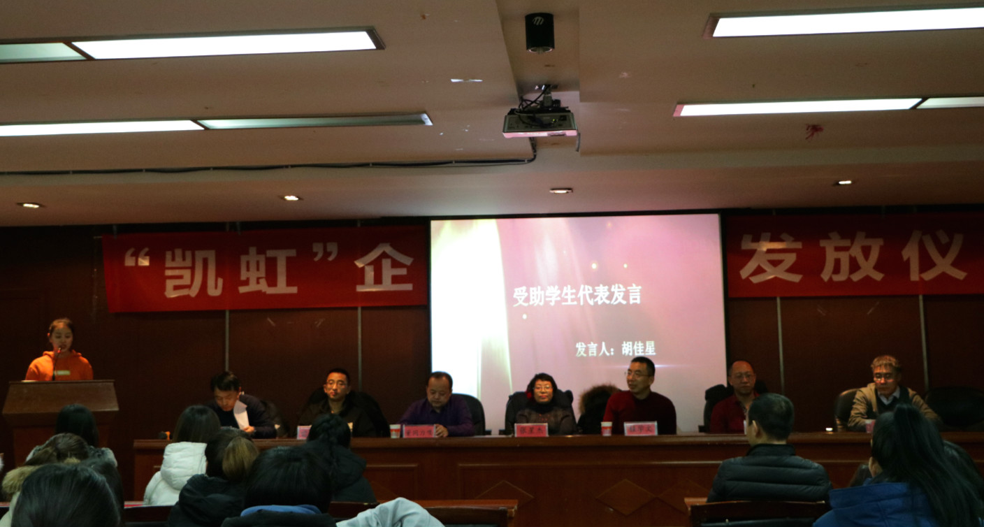 张星杰书记代表学院党政及全体师生,对“凯虹”公司的爱心善举表示由衷的感谢。并希望以此为开端和契机,进一步加强与企业的合作,在人才培养、科学研究、校企合作等方面做进一步的探讨研究。她告诫同学们,助学金的背后,所蕴涵的是一份爱心,一份期待,它所带给大家的是更多的责任感和使命感。她希望同学们要把这份荣誉永久地保留在自己的心里,让它成为自己心怀感恩、不断前行的方向和动力。她还鼓励同学们要打破传统就业观念,去外省市就业,开阔眼见,丰富自己的人生。