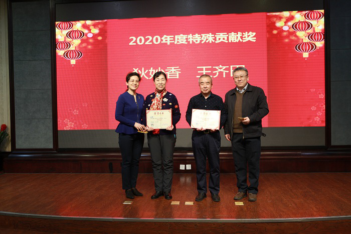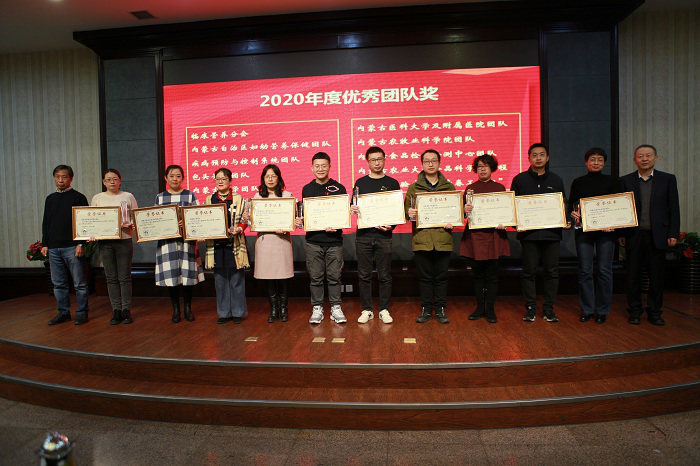 内蒙古自治区科学技术协会主席赵吉教授和名誉理事长张和平教授为优秀团队颁发2020年度先进团队奖