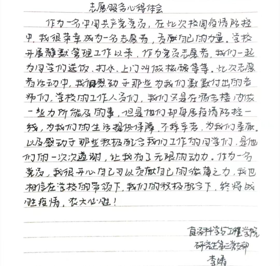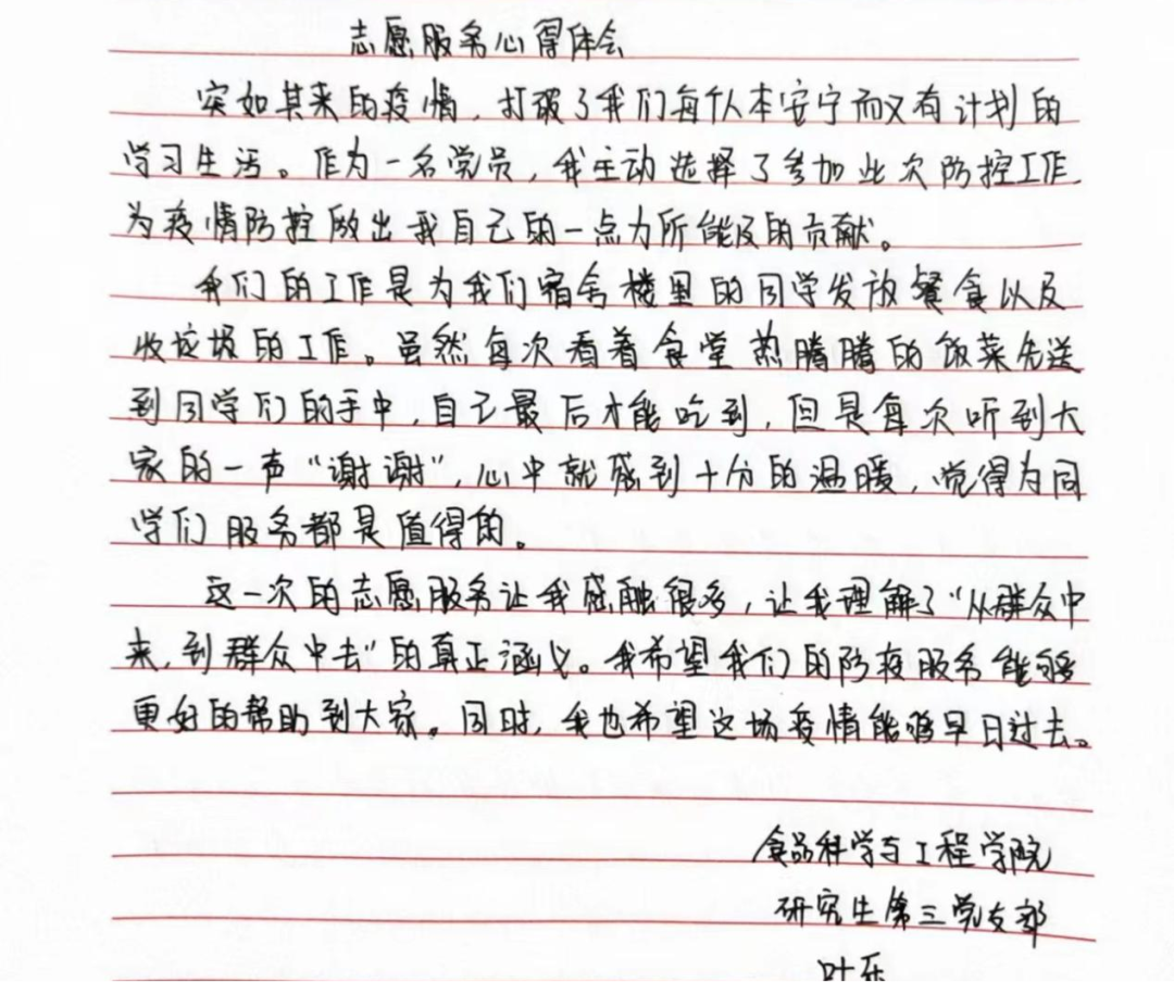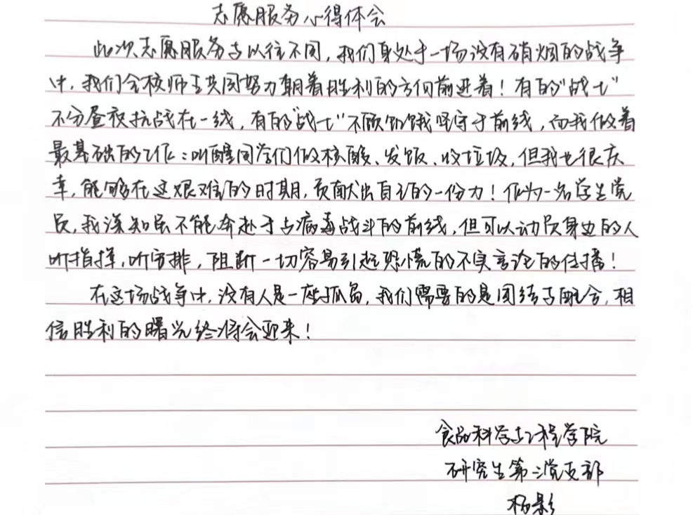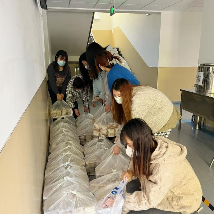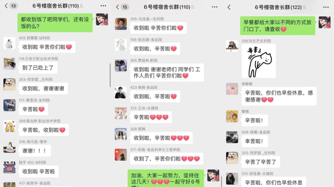在餐食发放后,总能收到来自同学们的感谢,大家的每一句“辛苦了”都让我们既感动又满足,让志愿者们对工作充满热情和信心。我们相信,只要我们努力坚持,就一定会扛过这场战“疫”。