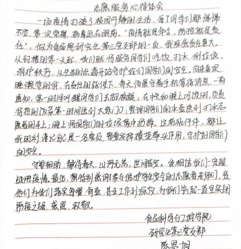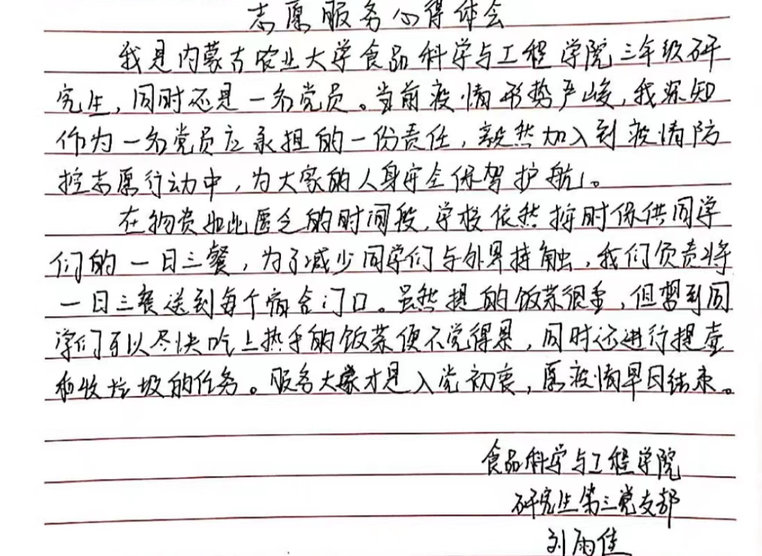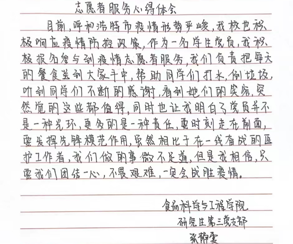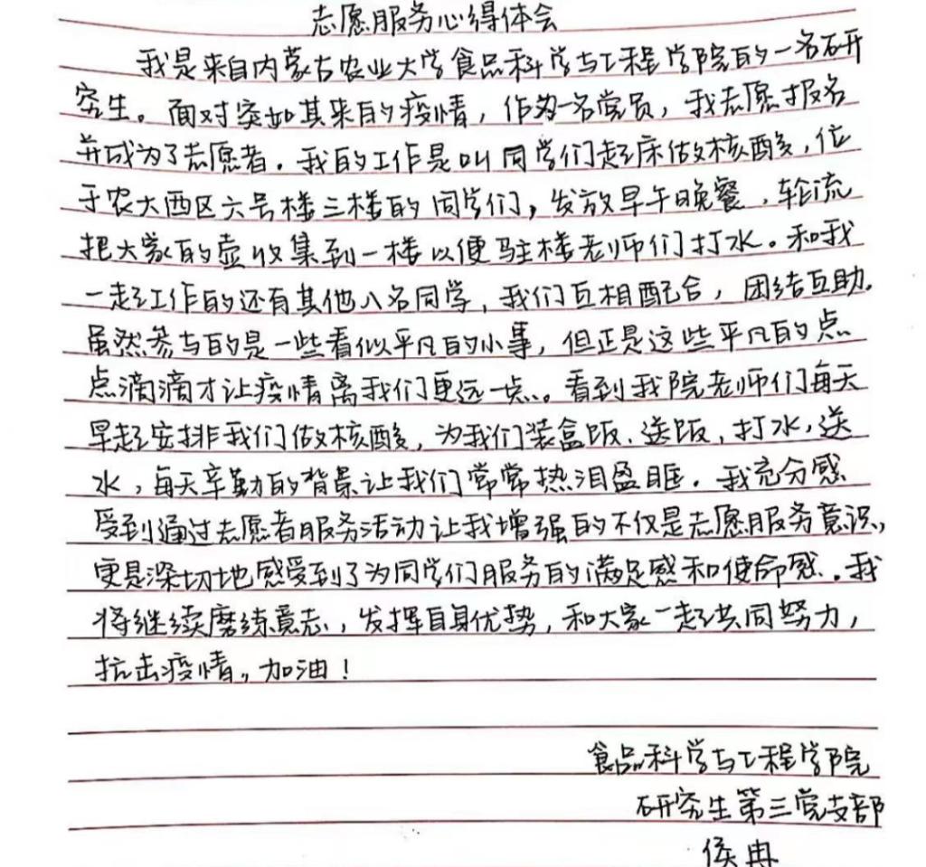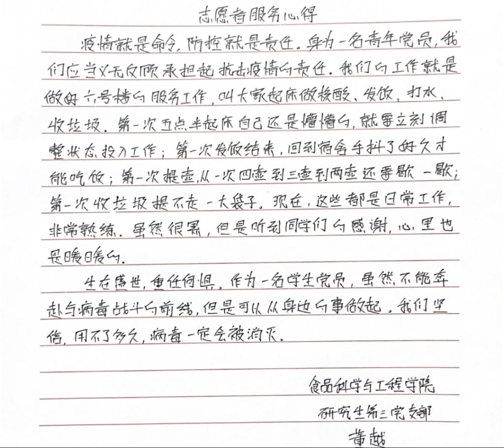 在餐食发放后,总能收到来自同学们的感谢,大家的每一句“辛苦了”都让我们既感动又满足,让志愿者们对工作充满热情和信心。我们相信,只要我们努力坚持,就一定会扛过这场战“疫”。