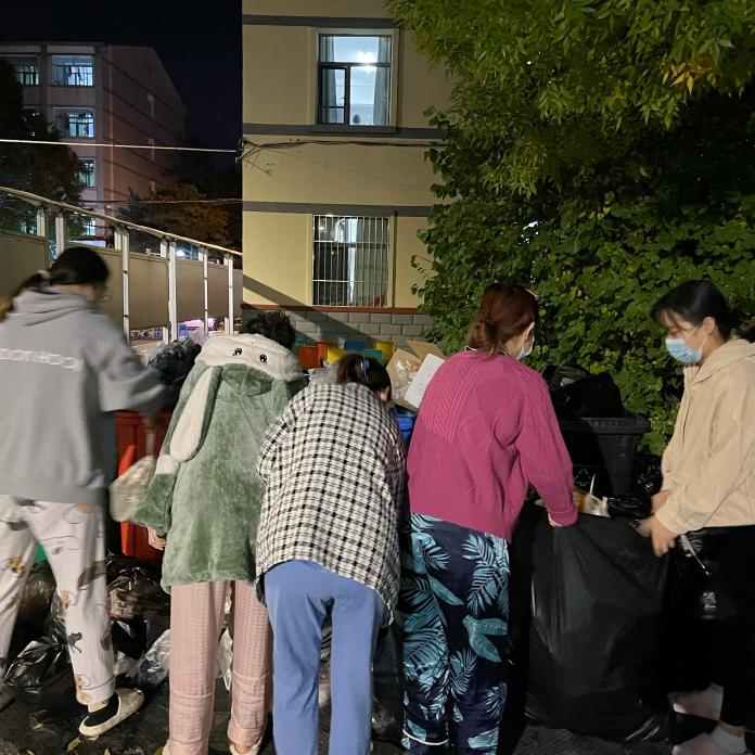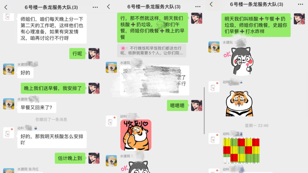 我们主要是负责6号公寓楼的送餐、物资发放、核酸检测、垃圾处理等工作,同时协调配合其他学院一起维护6号公寓楼的日常管理。6号公寓楼共居住了9个学院的研究生,有105个宿舍,325人。我院、水建院和动科院的志愿者自发的承担起日常工作,各学院通力合作,积极配合驻楼辅导员完成每日任务,由于我院学生基数较大,所以我们的志愿队伍主动承担了大部分的工作。我和其他学院的负责人每日及时沟通,分配任务,下发工作到自己学院的志愿服务队中。同时监督管理各楼层流动情况,尽量避免人员交叉。此外还会解决一些同学的日常生活问题,比如送药、生活用品发放等。
