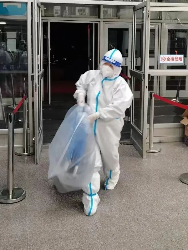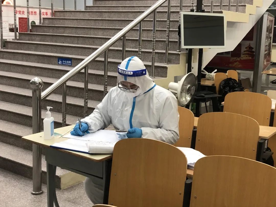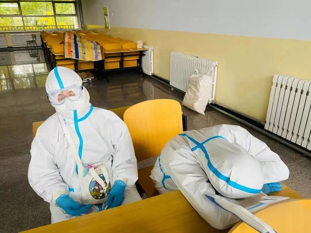 课堂上,杨飞芸老师正在深入浅出地讲授专业知识并叮嘱同学们面对疫情要坚定信心,相信国家,积极配合,做好防护。干货满满的课堂不仅让同学们享受学习的快乐,也发挥了课程思政的育人作用。课后,杨老师与其他老师一起搬床、搬行李,送饭收垃圾,还耐心细致地做好密接同学的思想工作,安抚大家焦虑的情绪。实在太累了,她又担心穿脱防护服浪费时间,就靠在椅子上眯一会,听到有新任务就立刻起身投入到紧张的工作中去。