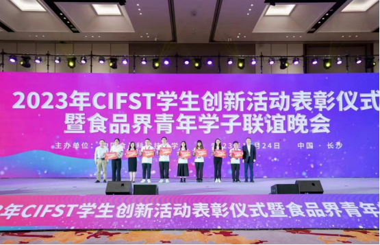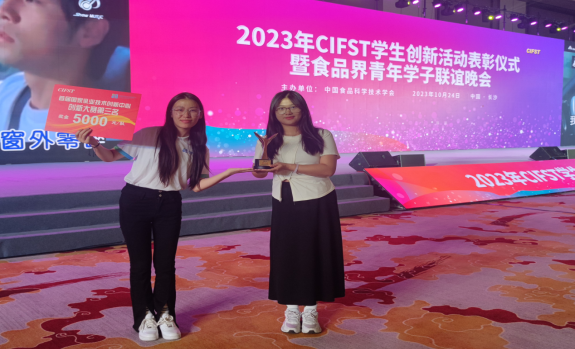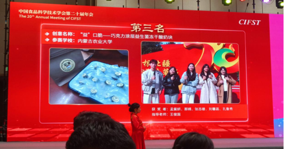 10月24日,由国家乳业技术创新中心与中国食品科学技术学会共同举办的“CIFST-首届国家乳业技术创新中心创新大赛”在长沙举办颁奖仪式。我院21级本科生孟紫妍、那婧、张志雄、孔鲁秀、经济管理学院刘馨蕊同学在我院副院长王俊国教授的指导下,其团队项目“‘益’口脆——巧克力涂层益生菌冻干酸奶块”获得第三名的佳绩。