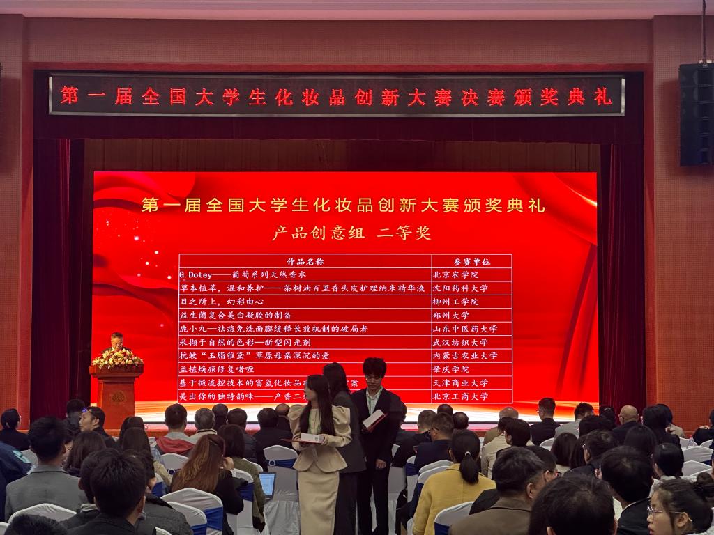 11月2日至11月4日,由教育部轻工类专业教学指导委员会指导、中国日化协会主办、北京工商大学和化妆品学科建设与创新发展专业委员会承办的第一届全国大学生化妆品创新大赛于北京工商大学举行。300支初赛队经过层层选拔,最终75支团队进行产品创意组、配方设计组以及包装宣传组三个组别的决赛比拼。