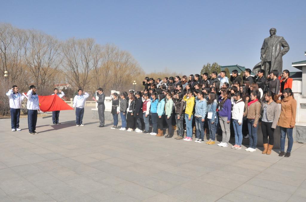 校车于9:15到达乌兰夫纪念馆,宣誓仪式在9:30正式开始。全体预备党员背对乌兰夫雕像整齐划一的排列开,四名旗手身着校服,手举党旗与全体宣誓人成直角庄严地站在前方一侧,全体预备党员举起右手,面向党旗,在徐之昊同学的领誓下,嘹亮宣誓。整个过程庄严肃穆,振奋人心,一句句誓词不间断的回荡在整个宣誓场地,使前来参观的游人也驻足观看,融入其中。