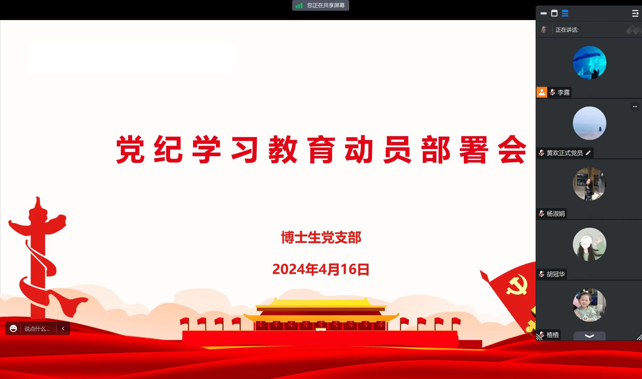 学院党委统一部署后各党支部迅速行动召开支部大会,传达校院两级党纪学习教育决策部署并开展支部集中学习,旨在将党纪学习教育相关工作部署到每一位党员,使全院师生党员在思想上受到深刻洗礼,在行动上得到有力锤炼,为推动学院各项工作再上新台阶提供坚强纪律保障和政治保证。