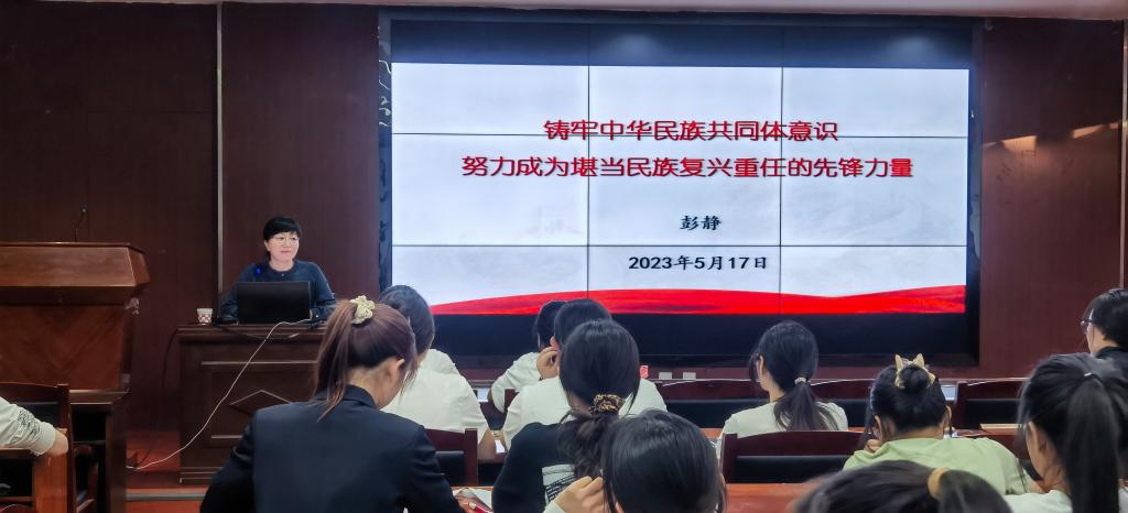 课上,彭静老师以“铸牢中华民族共同体意识,努力成为堪当民族复兴重任的先锋力量”为题,结合党的二十大报告,分别从“准确理解铸牢中华民族共同体意识”、“铸牢中华民族共同体意识的重要途径”、“铸牢中华民族共同体意识重在落实”这三个方面深刻阐述了铸牢中华民族共同体意识,并结合各民族交往交流交融的优秀事例,对其深刻内涵和现实意义进行了全面解读,教育引导大家牢牢把握“四个共同”和“五个认同”,切实铸牢中华民族共同体意识。