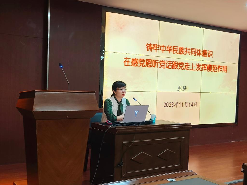 课上,彭静老师以“铸牢中华民族共同体意识,在感党恩、听党话、跟党走上发挥模范作用”为题,结合各民族文化交往交流交融的优秀事例,分别从“准确理解铸牢中华民族共同体意识”、“铸牢中华民族共同体意识的重要途径”、“铸牢中华民族共同体意识重在落实”这三个方面深入讲述了铸牢中华民族共同体意识,并结合了各民族之间文化的共同性和差异性,对其深刻内涵和现实意义进行了全面解读。最后,彭静老师鼓励全体发展对象做新时代传承和弘扬中华民族共同体意识的坚定拥护者和忠实践行者,在日常生活中规范自身行为,以身作则,发挥身为发展对象的先锋模范作用。