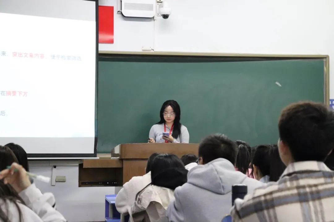 竞赛服务部部长梁婷、李悦佳分别就论文撰写和排版进行详尽讲解,并通过现场演示,直观地向大家展示了论文排版的要点。两位部长的详细讲解不仅帮助同学们提高了论文撰写和排版的能力,还为大家未来的学术研究和探索奠定了坚实的基础。宣传部部长王晶依次从精确定位选题、广泛搜集文献、细致整理资料以及撰写时的策略技巧,全方位解读了综述。通过她们的耐心讲解,同学们对论文以及综述的撰写有了更精准的掌握。