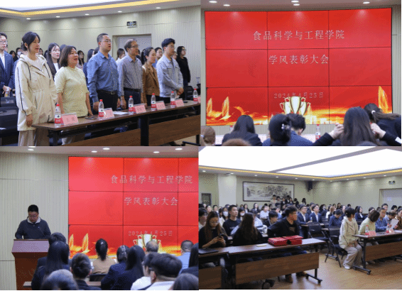 张鹏飞作总结讲话。首先对受到表彰的集体和个人表示祝贺。他对学院开展的学风建设工作进行了总结,同时对学风建设的具体措施进行了详细的阐述。他强调,学风关乎着人才培养的质量,同学们要秉承“团结、求实、博学、创新”的校训,勤奋守纪,勤学好问,勇于探索新知识,在青春的赛道上奋力奔跑,跑出食品学子的风采。