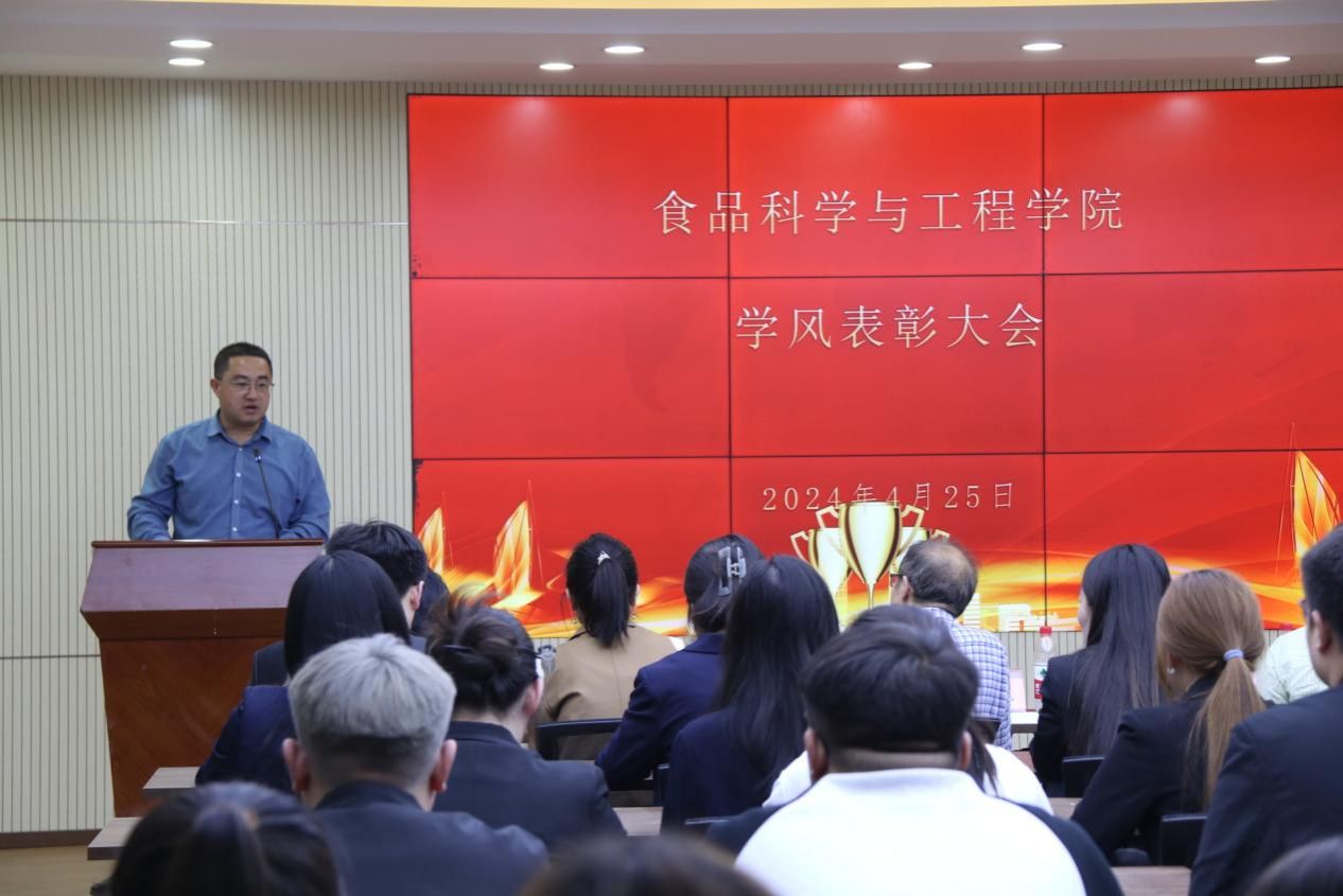 张鹏飞作总结讲话。首先对受到表彰的集体和个人表示祝贺。他对学院开展的学风建设工作进行了总结,同时对学风建设的具体措施进行了详细的阐述。他强调,学风关乎着人才培养的质量,同学们要秉承“团结、求实、博学、创新”的校训,勤奋守纪,勤学好问,勇于探索新知识,在青春的赛道上奋力奔跑,跑出食品学子的风采。